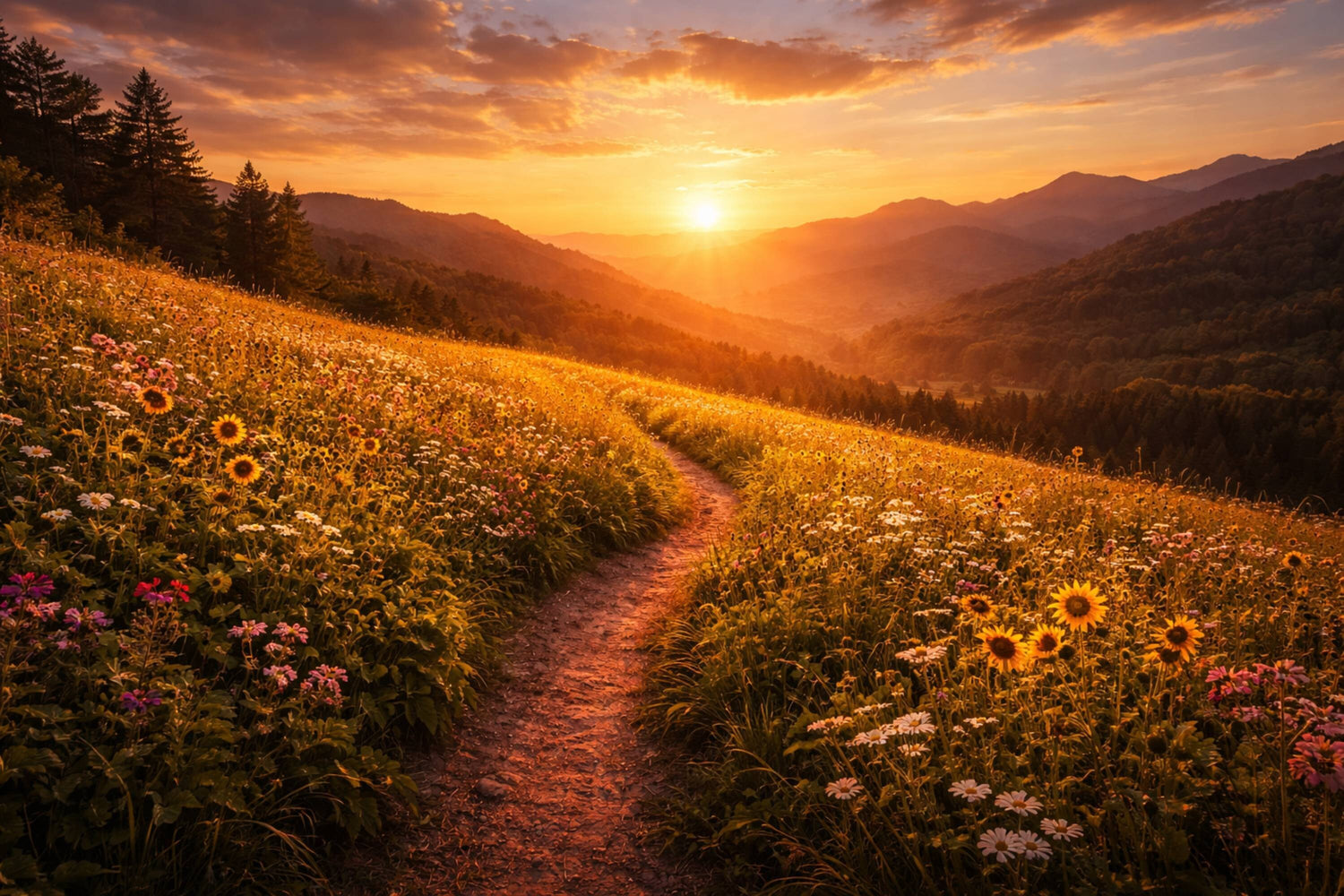 夕日に照らされた丘一面の花々と、奥へと続くやわらかな小道。