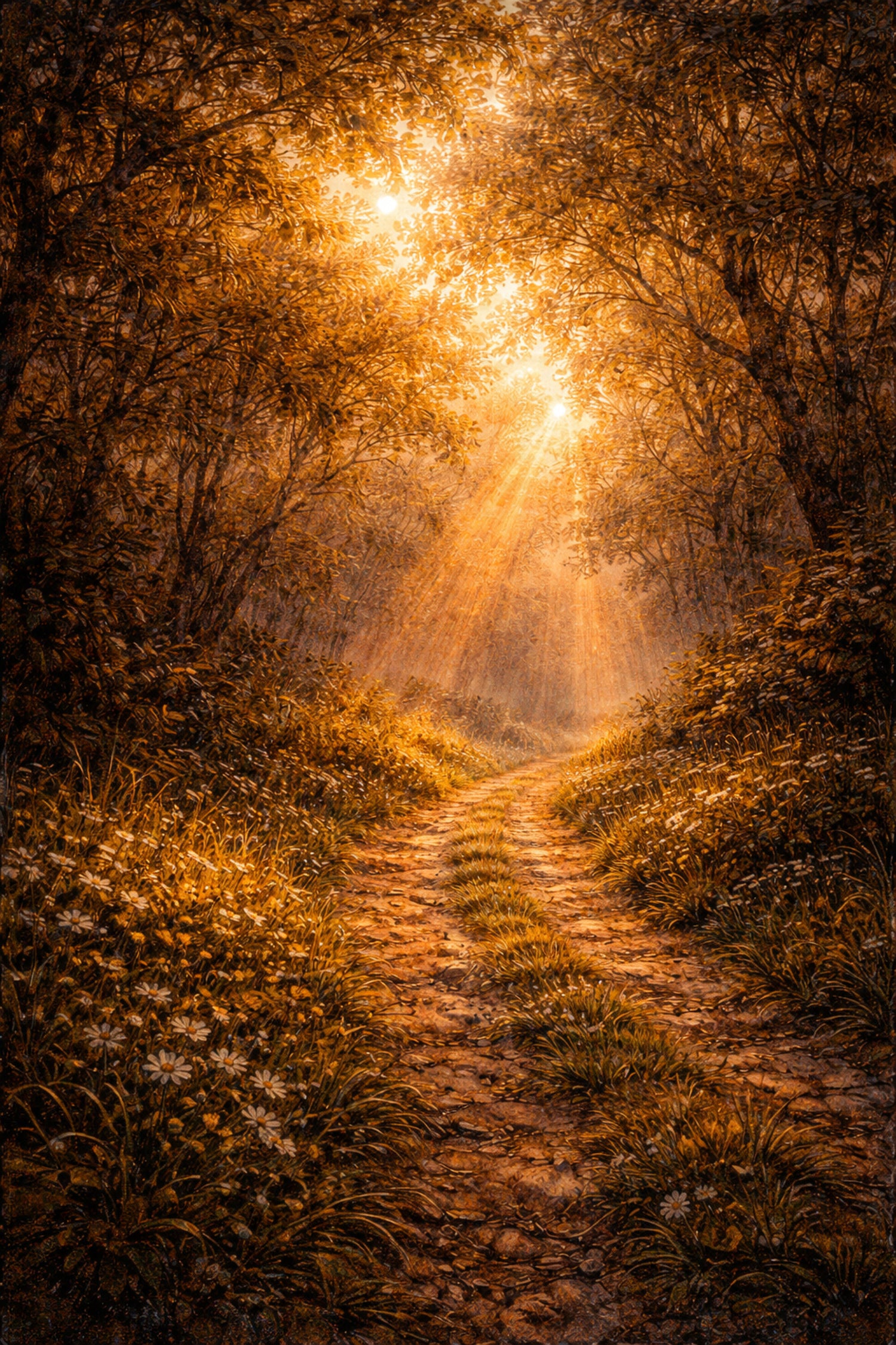 深い森の中に差し込む黄金色の光が、静かな小径を照らす幻想的な風景作品です。
