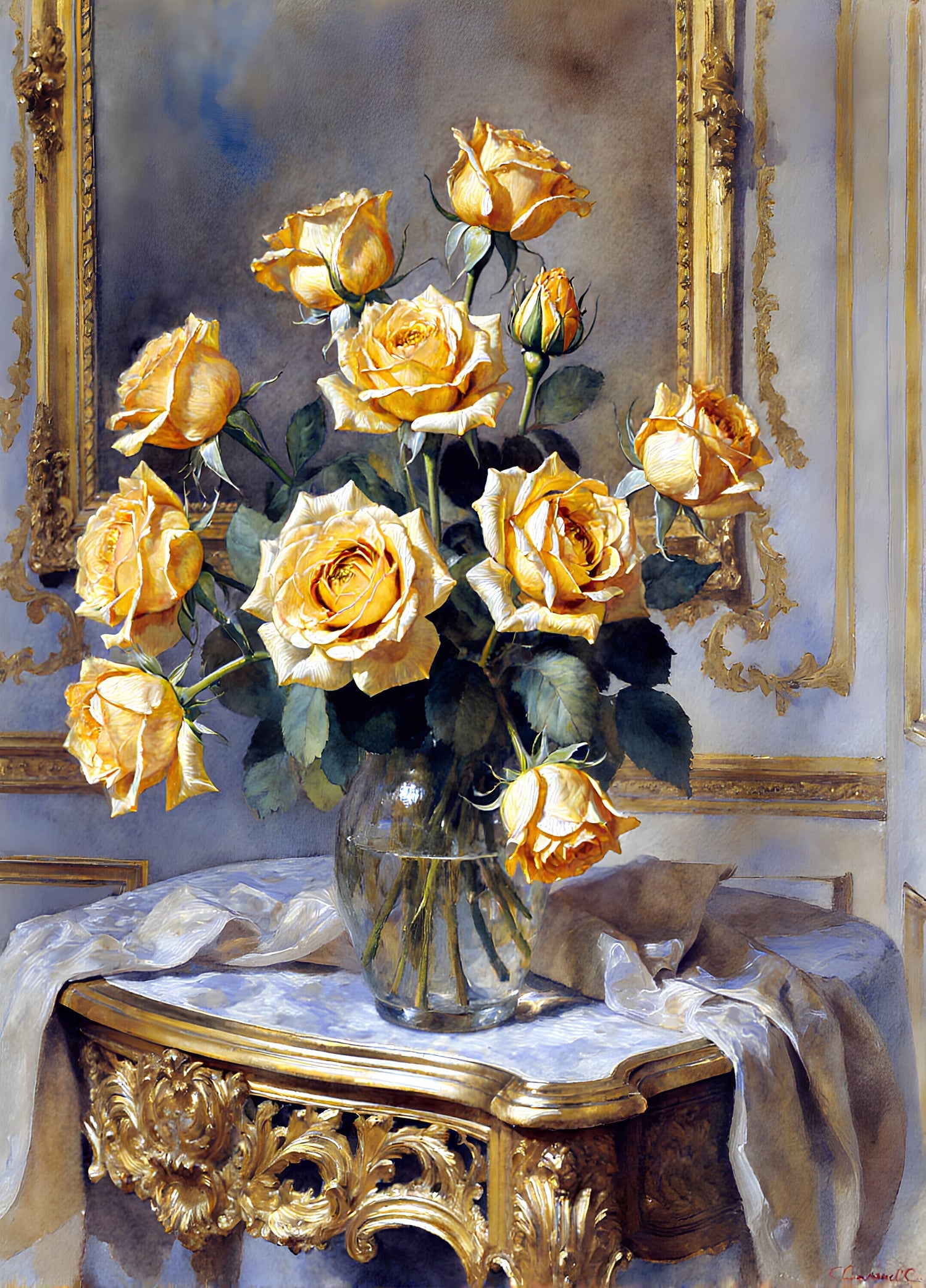 豪華なテーブルの上に黄金色のバラが飾られています。