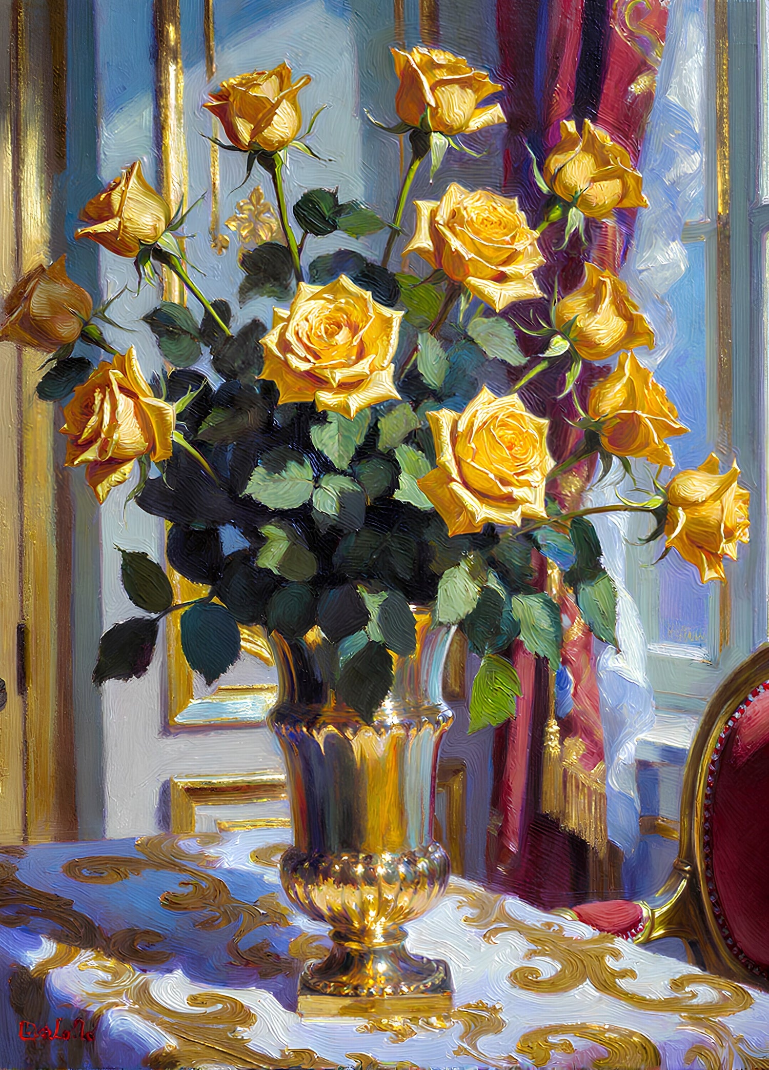 豪華なテーブルの上に黄金色のバラが黄金色の花瓶に挿してある。