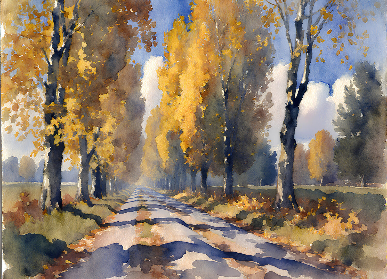 晩秋のよく晴れた朝、並木が黄金色に輝いています。