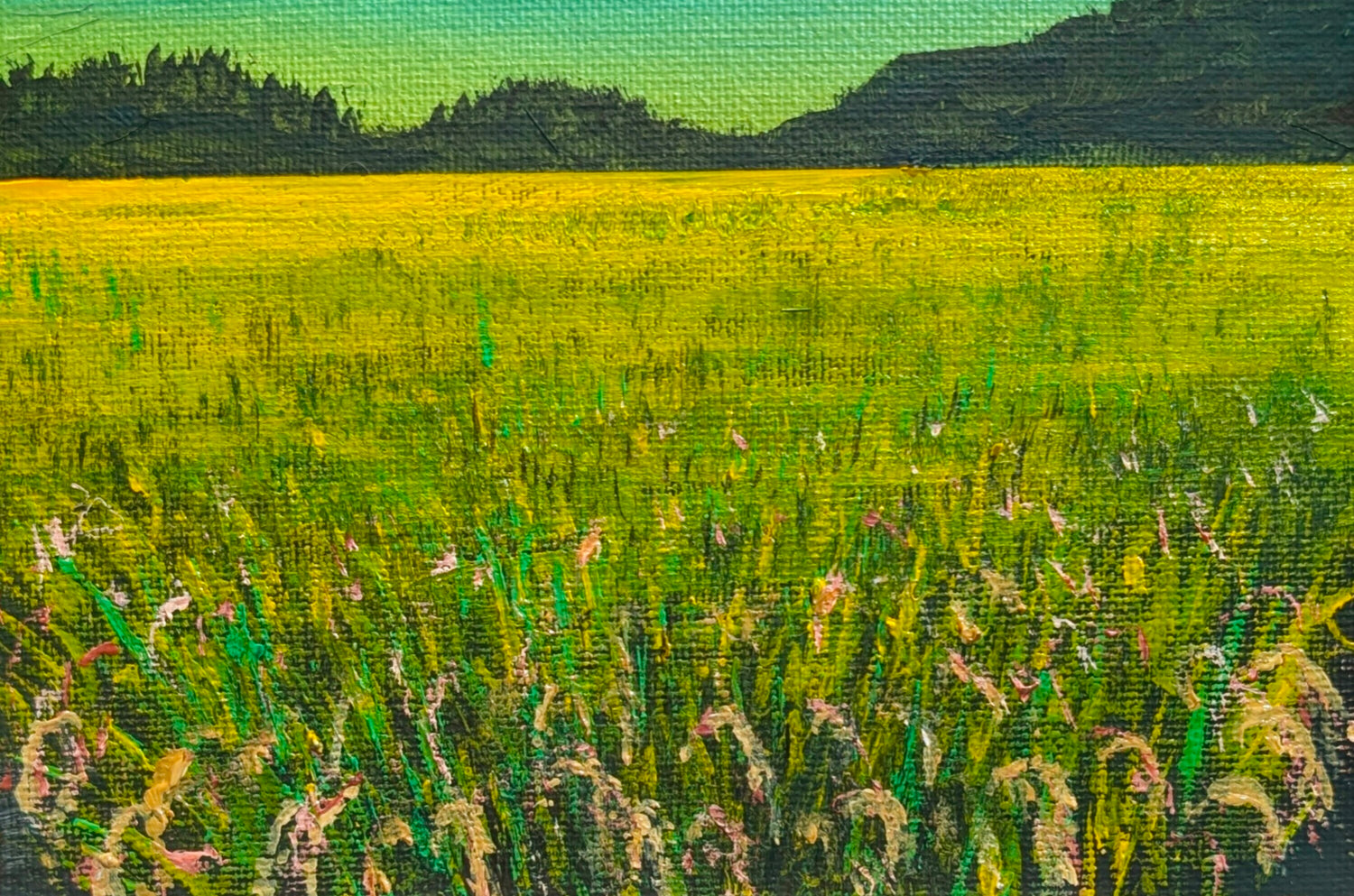 西日を受けて黄色ぃ絨毯のような田んぼを描きました。