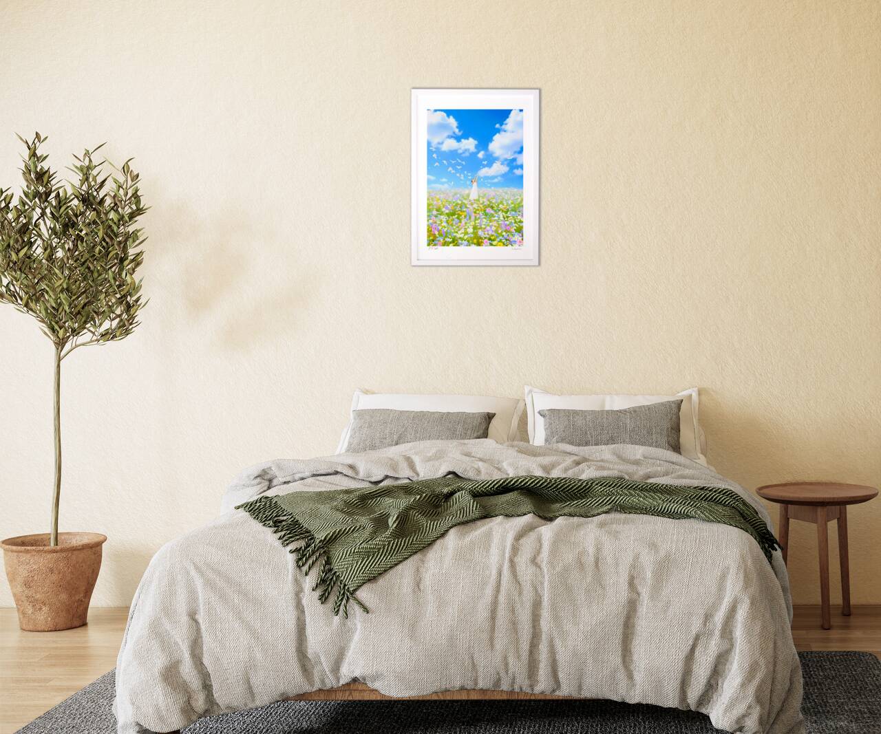 あゆわらの企画・制作・販売の作品。 画用紙のような質感の高級アート紙を採用。 発色が豊かなので繊細な色を忠実に再現。 印画紙ではないので、絵なのか写真なのか迷う不思議な印象です。 紙に光沢がなく、光を反射しないので、 蛍光灯の光で作品が見えづらくなることもありません。 色の再現性もこだわりました。 色調整は、最新技術で厳密に行うことが出来ます。正確に色を再現できるデジタル印刷で一枚一枚制作。 品質をチェックし、合格したものにあゆわらのエンボス印を入れて完成となります。