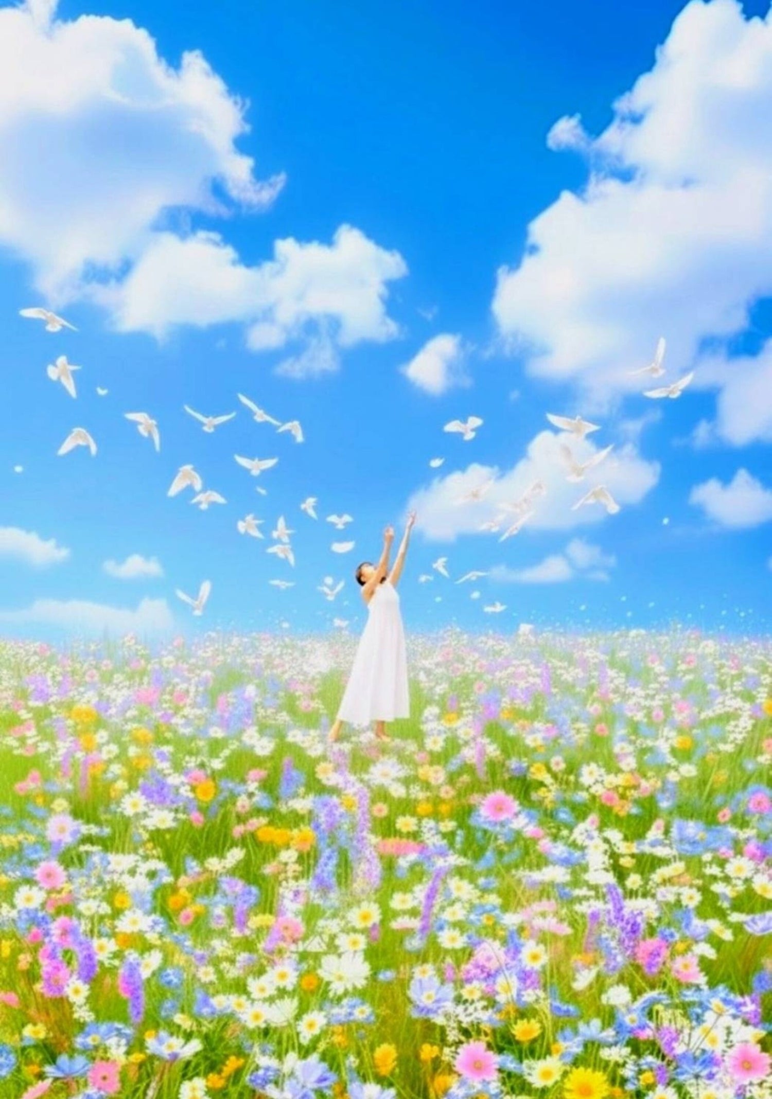 降り注ぐ優しい陽射しが、彼女を包み込み、信念が未来を照らします。