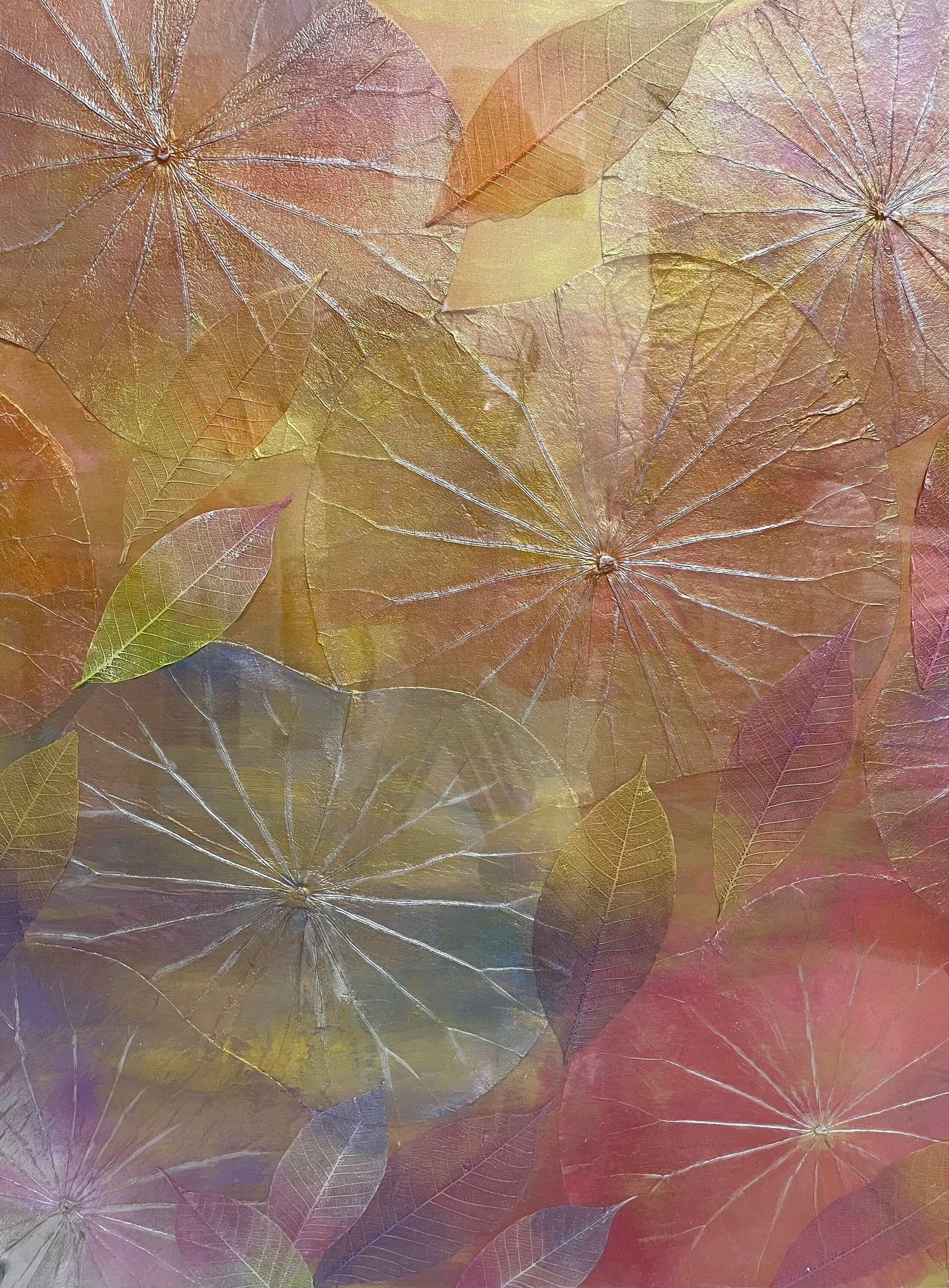 ボタニーペインティングは、蓮の葉やインド菩提樹などの天然素材をパネルに貼り付け、自由に彩色する日本発祥のアートです。絵の得意不得意に関わらず、誰もが楽しめる癒しのアートとして人気を集めています。