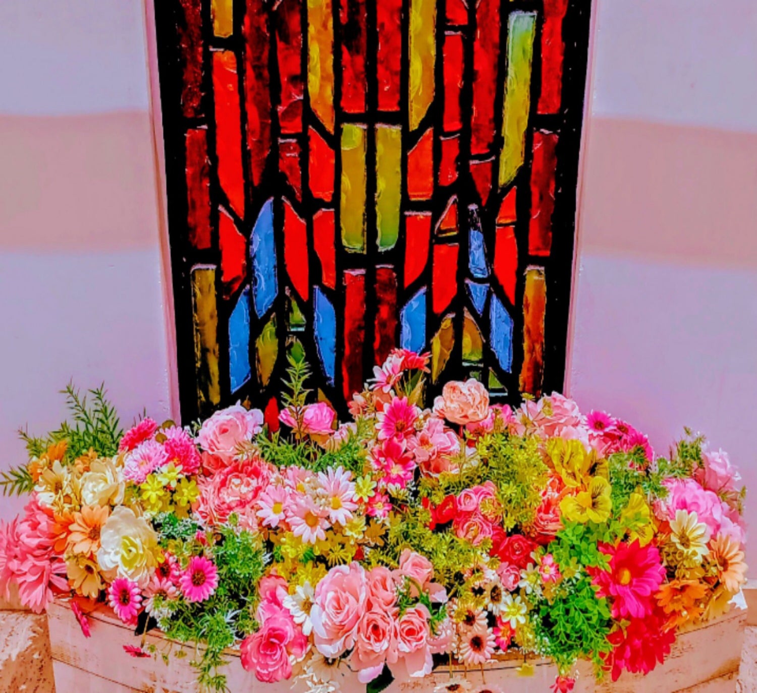Red & Blue & yellowのステンドグラスと、pinkのお花に魅せられての1枚です。