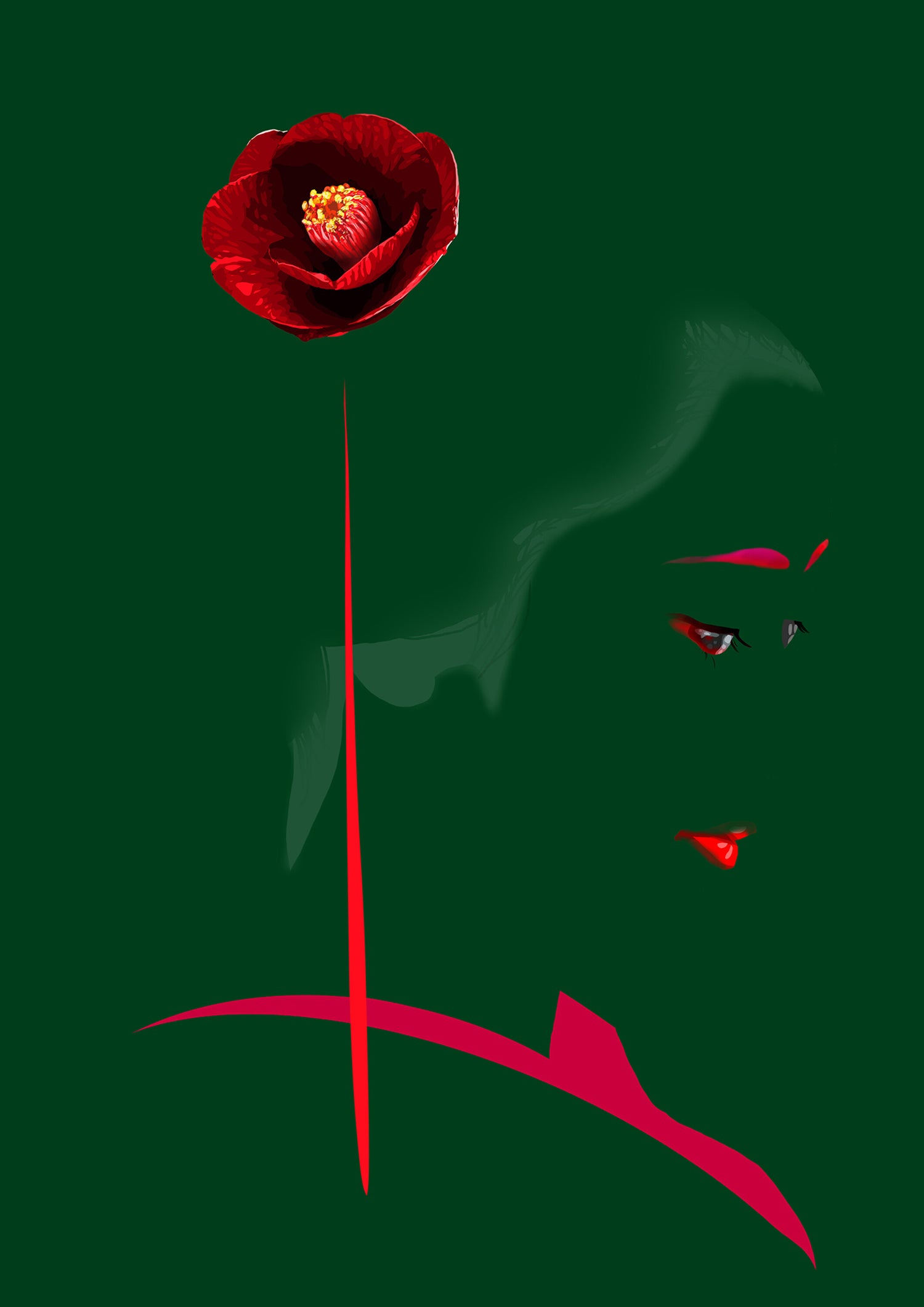 寂しい春浅い薄暗い森の中に一筋の光の中、一輪咲く赤い椿の花