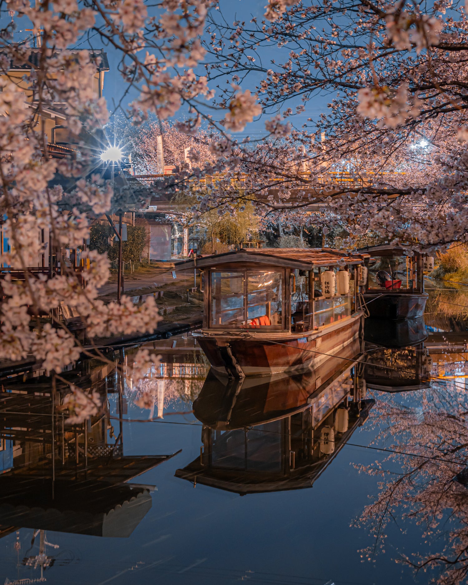 京都の桜を夜に撮影しました。桜と船のリフレクションが良い雰囲気に撮影できた写真です。