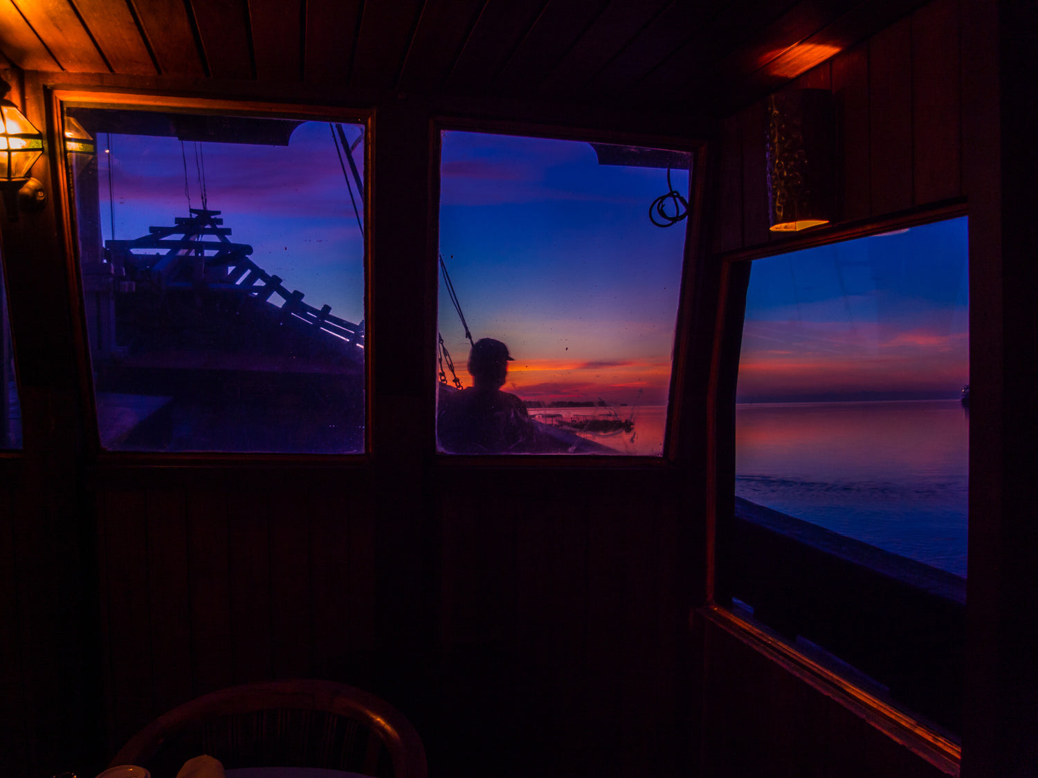 ミクロネシア連邦、ヤップ島のダイビングリゾートに浮かぶ帆船。船室はレストラン、デッキはバーに利用されている。賑やかなディナータイムが始まる寸前の静かな船室から、ラグーンが茜色に染まる一瞬をとらえた。