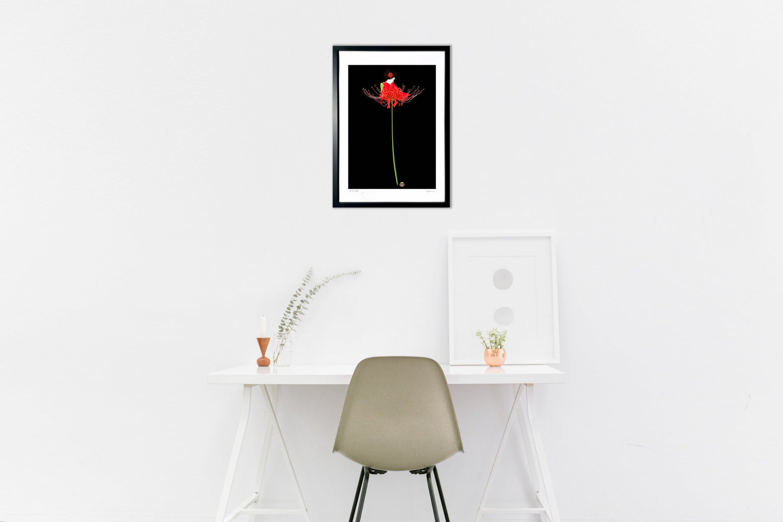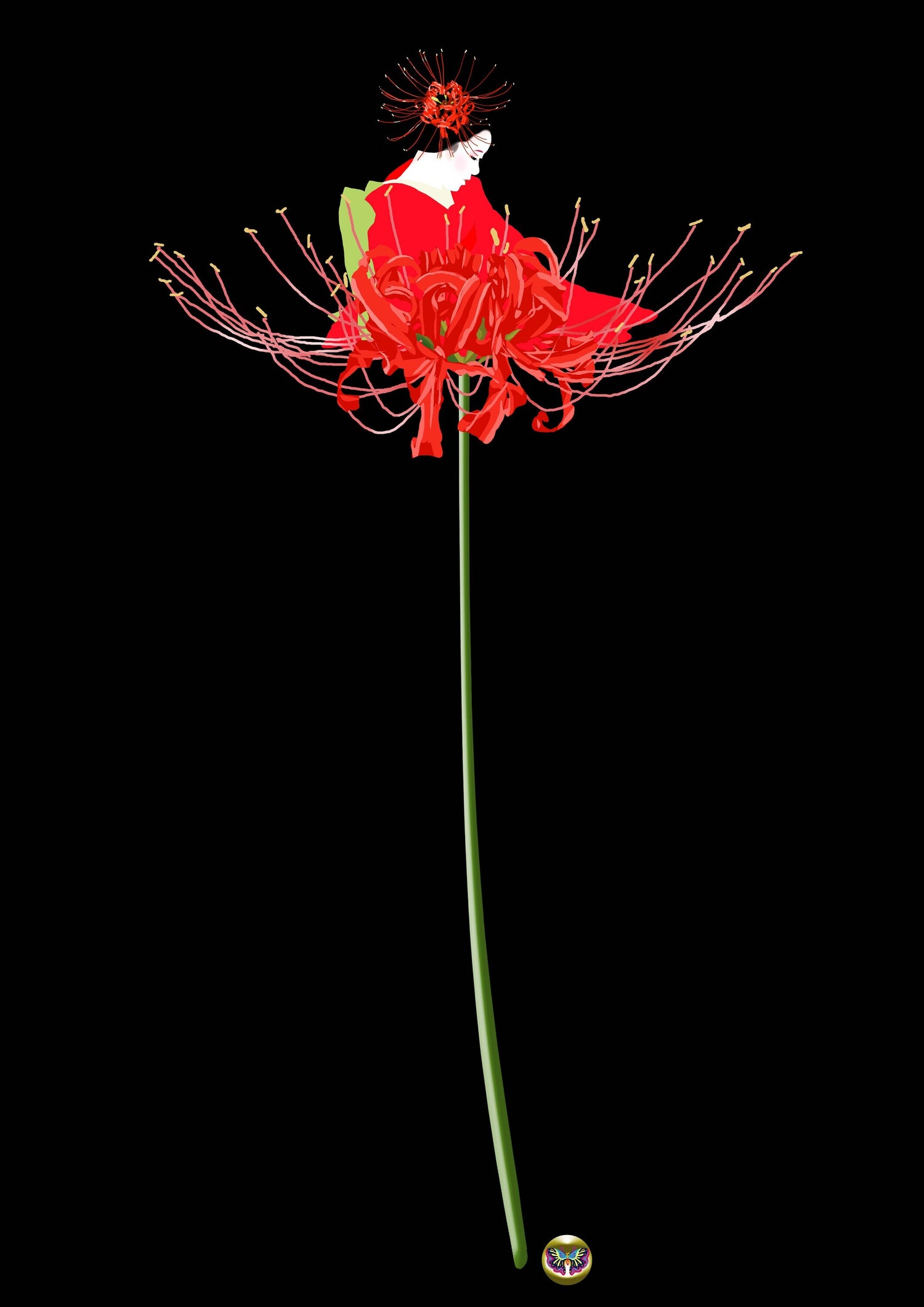 印象的な個性のシルエットとカラーの彼岸花を大胆に配置し和服の女性を花の精として表現