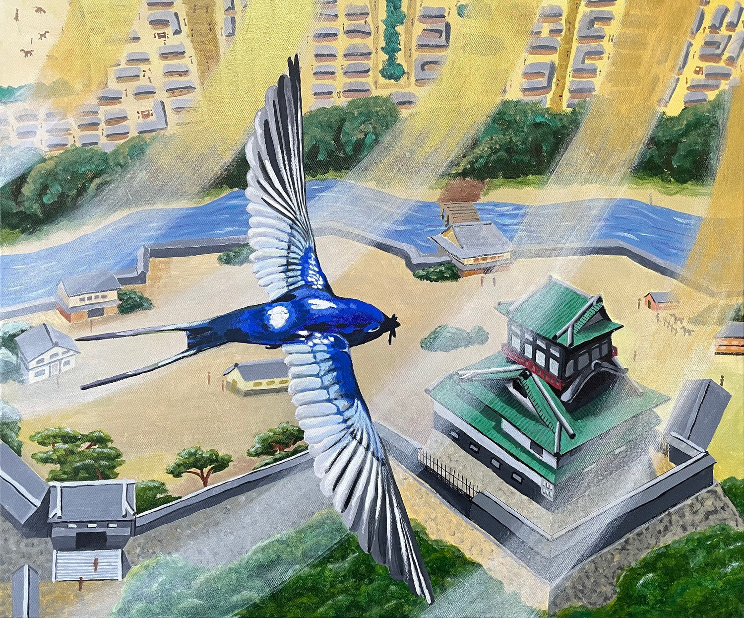 城の天守閣にでも巣作りしたのだろうか、親つばめが餌をくわえて城の上空を飛んでいる。