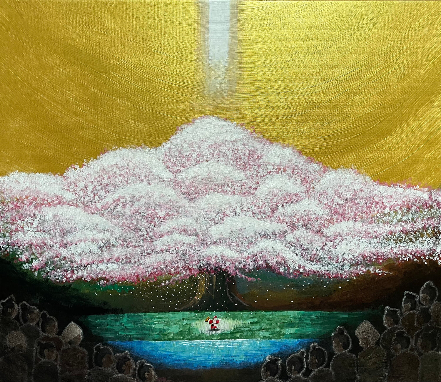 神事をイメージして空を金色にし、手前に江戸時代の農民達を配して日本画風に仕上げました。