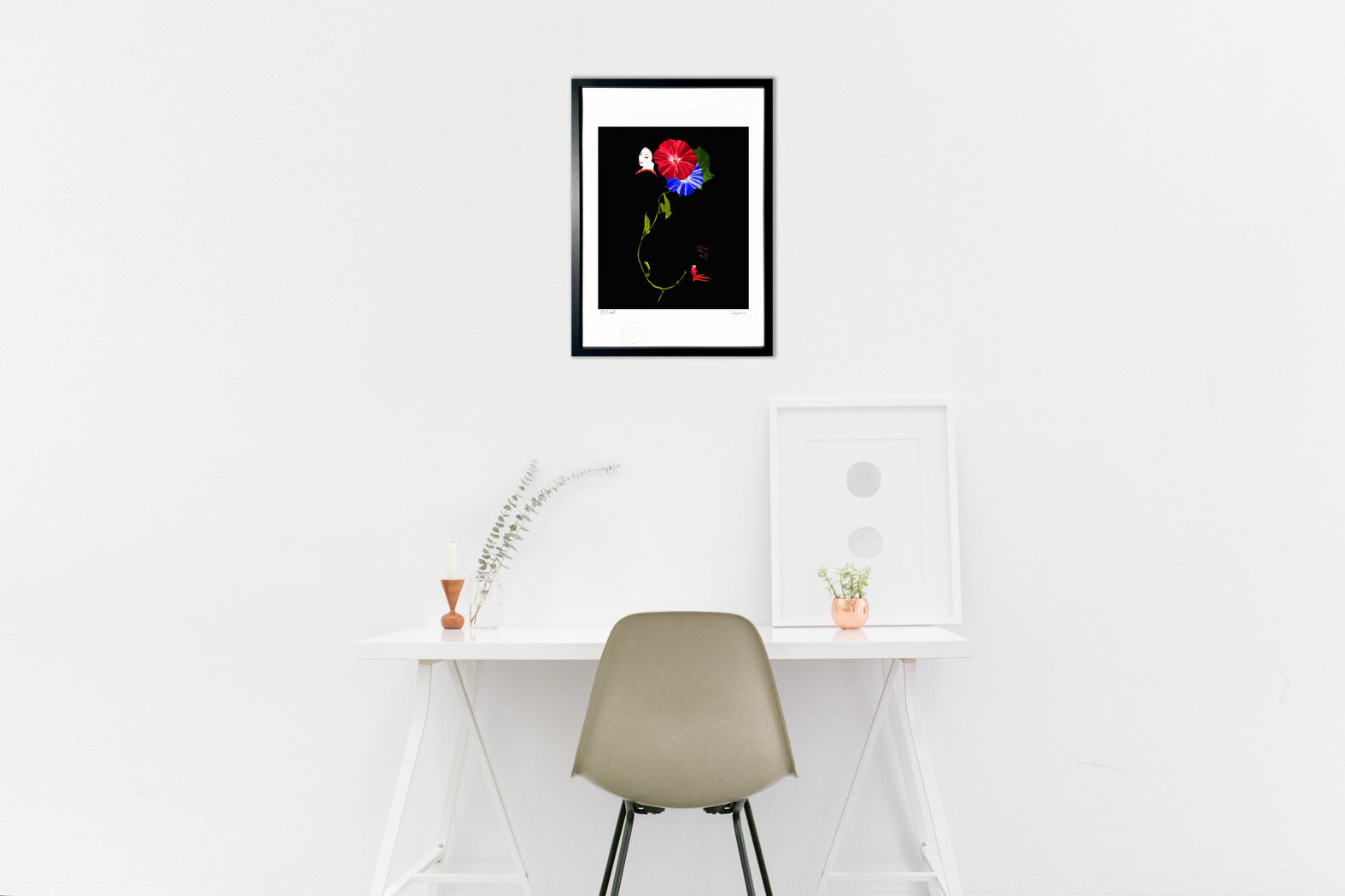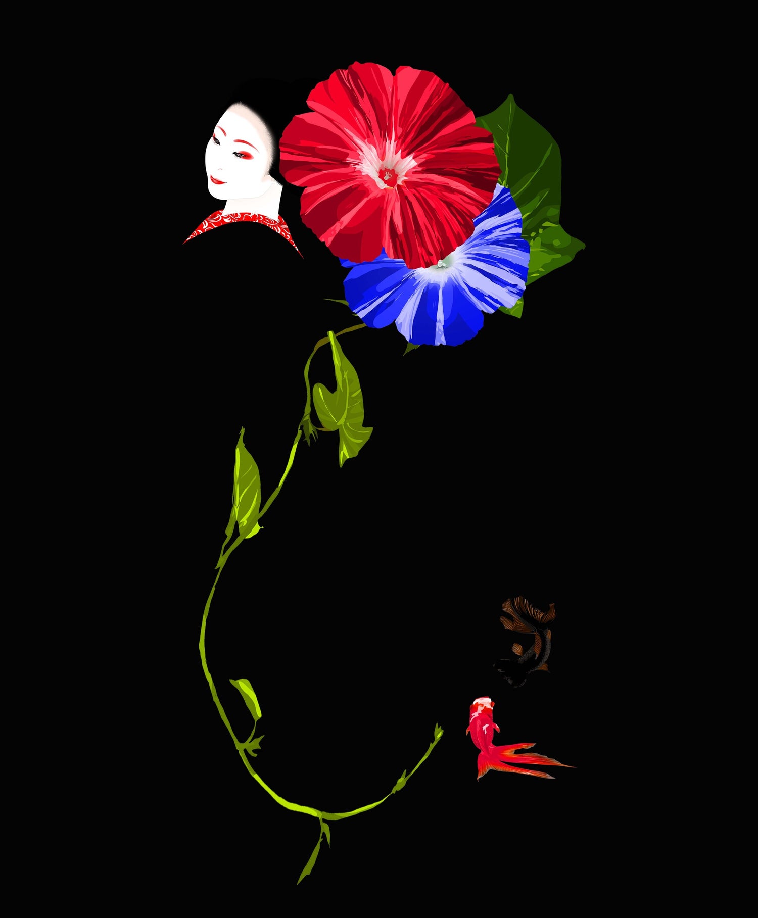 黒をバックに赤と青の朝顔 金魚 を纏うような女性