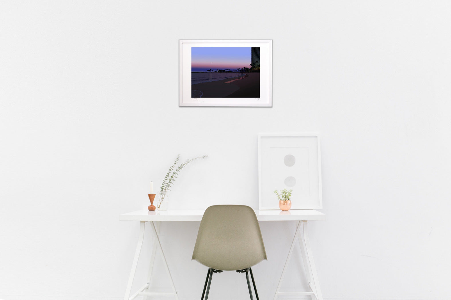 早朝、ハワイのヒルトン近くの海辺へ出かけてみると、静かな海に満月の光が淡く輝いていました。ホテルの窓に映る影や遠くのヤシなど細かいところまで見ていただけたらうれしいです。