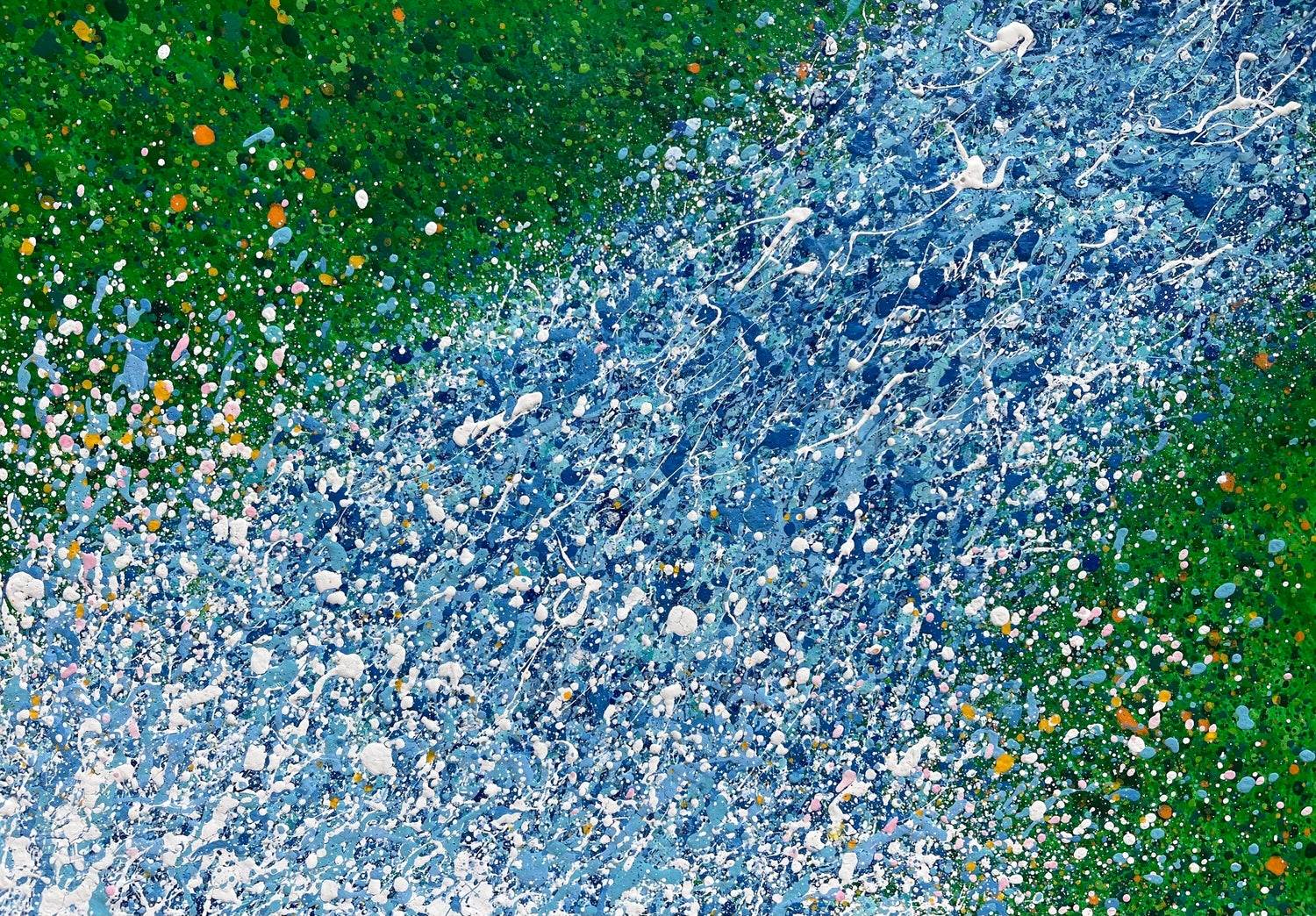 いつも流れゆく豊かな川、勢いよく流れてゆく場所など、筆を弾いて色を重ね表現しました。