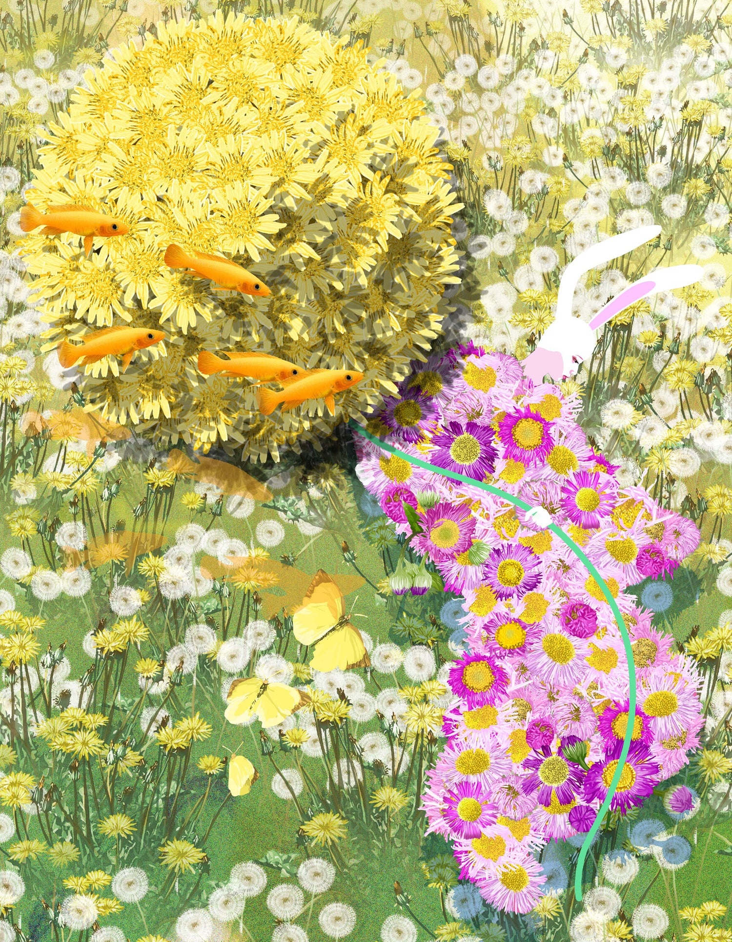 柔らかく暖かい春の光の下、タンポポの野原にキチョウが飛び交い、ハルジオンの衣装をまとった、春の妖精が遊んでいます。