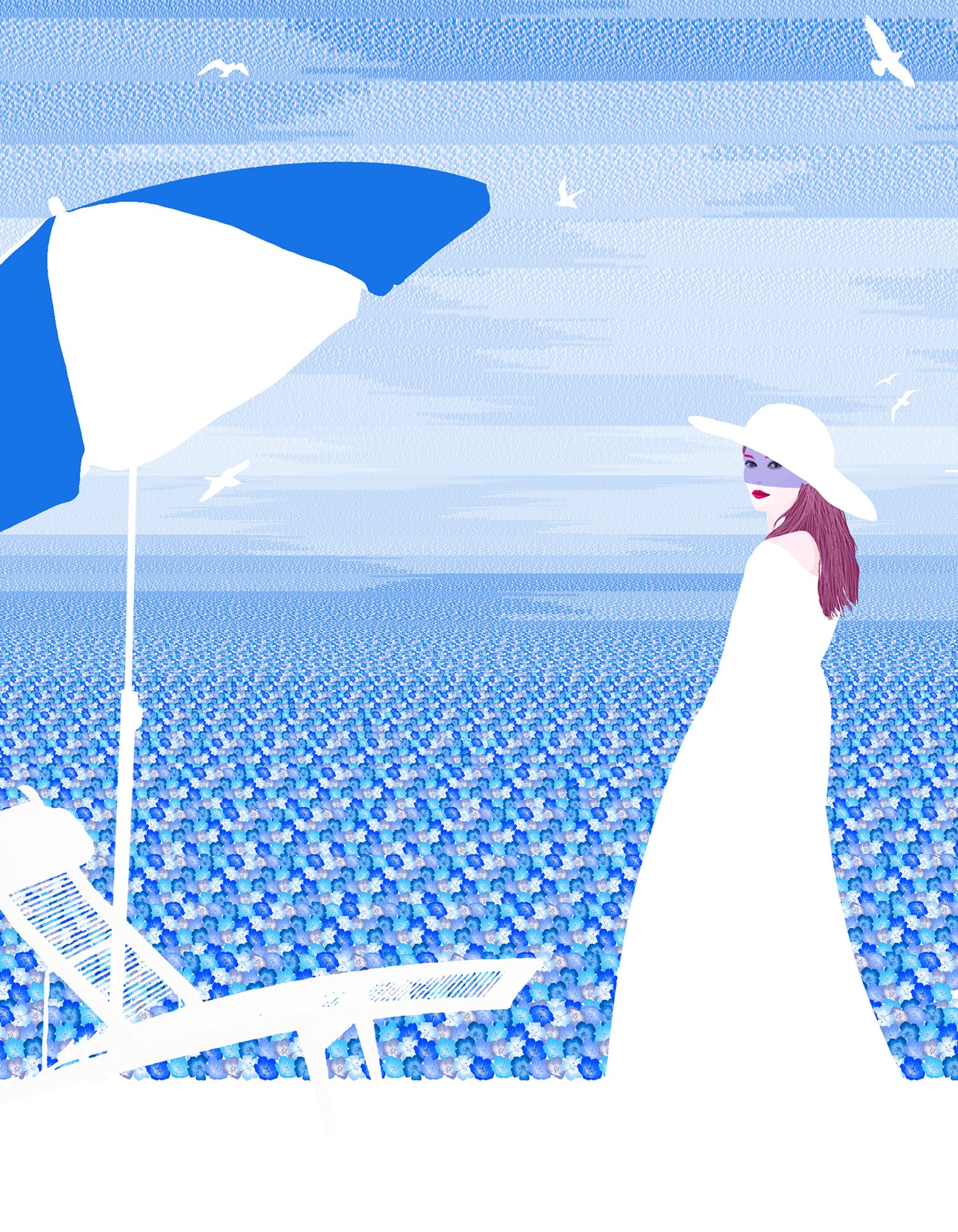 広がる青い海と白い砂。爽やかな潮風を楽しむ女性が一人