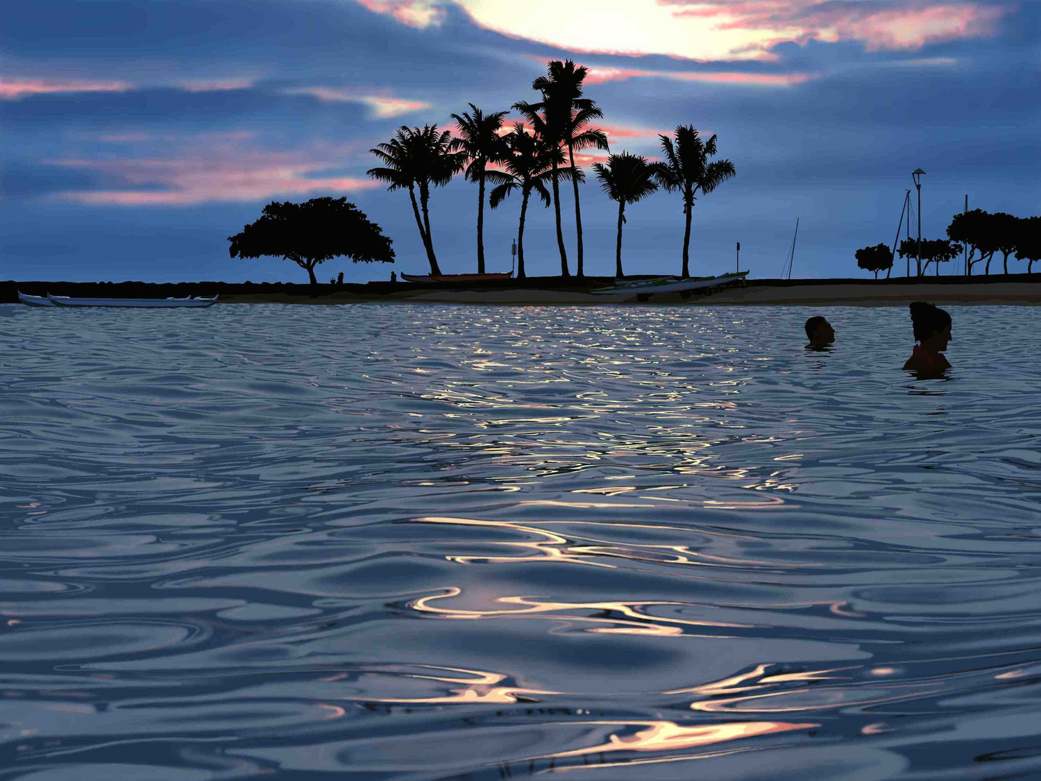 昼と夜の間に、何ともいえぬ静かで落ち着いた時間が流れています。波はなめらかにやさしく揺れ、空はひととき赤や紫に輝きながらも次第にモノトーンの世界へと入っていきます。